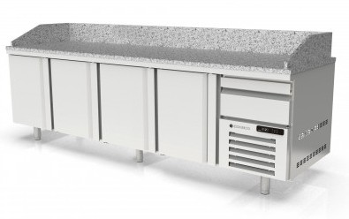 Table à pizza froid positif dessus granit avec 4 portes et 1 tiroir à pâtons - 2615x800x850 mm