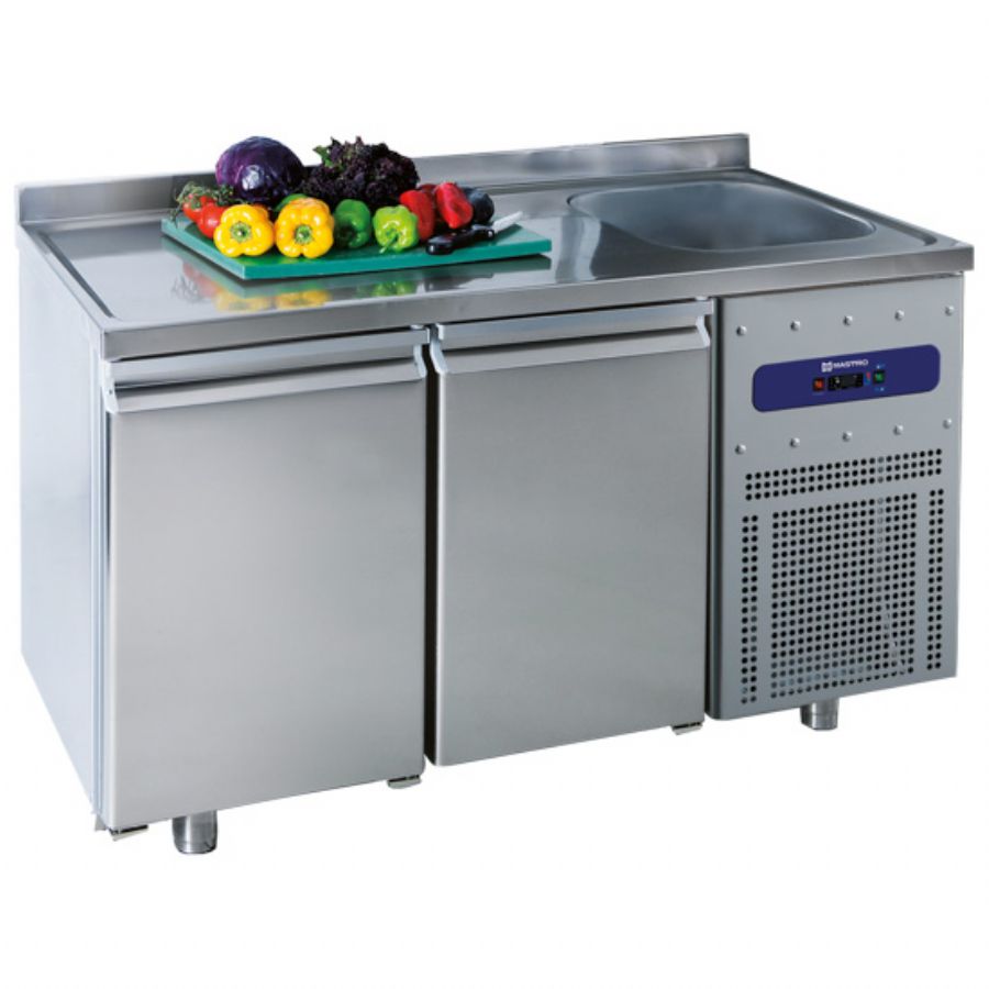 Table froide inox 2 portes avec évier à droite et dosseret température -2/+8°C