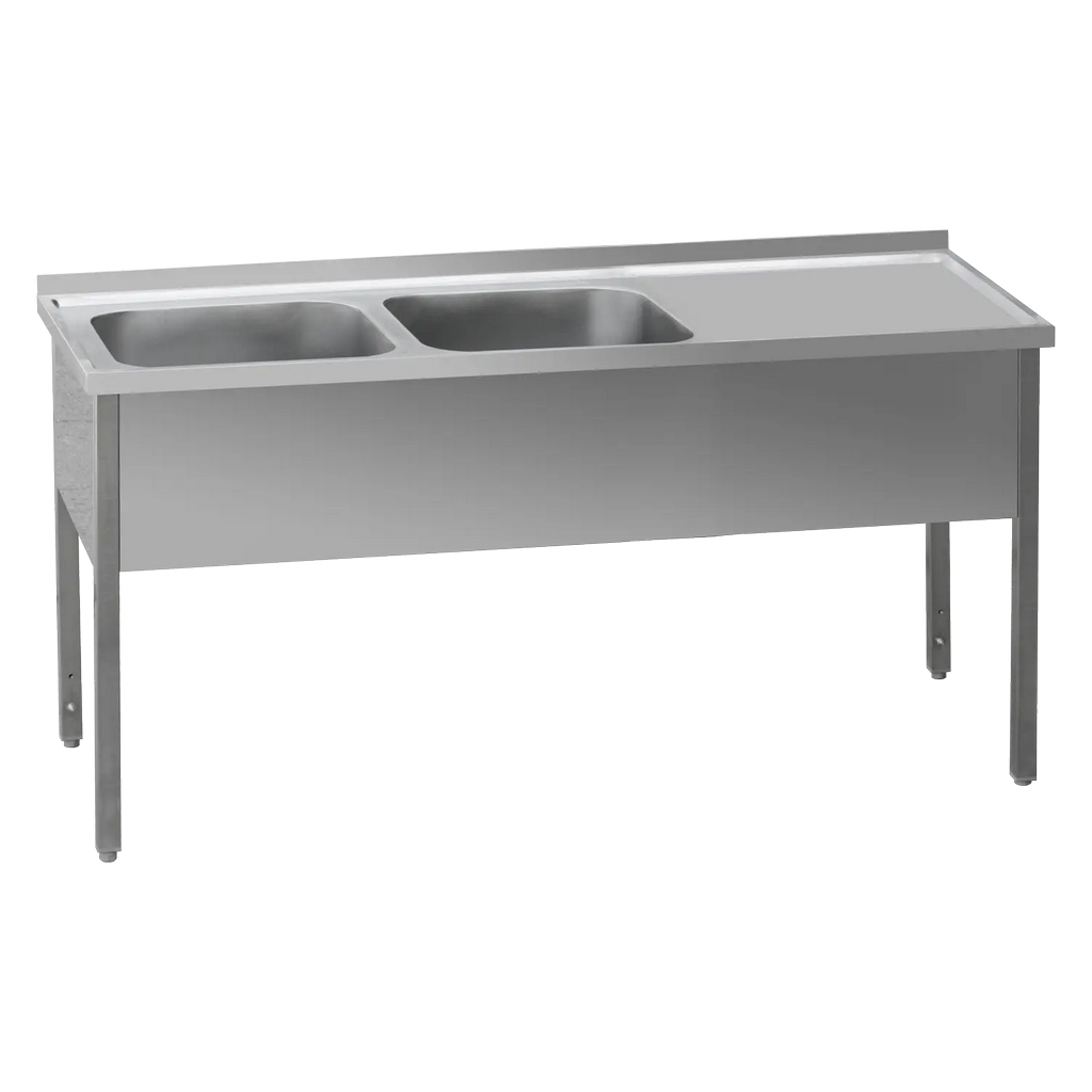 Table de lavage inox équipée de 2 cuves 60x50x30 avec zone d’égouttage à droite 210x70x90