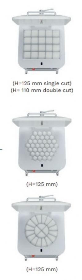 Dimensions (LxPxH) (mm) : 660x700x1100 Capacité (gr) : 80/500 Divisions : 40 Production (pièce/heure) : 4800 Capacité de pâte (kg) : 20 Poids (kg) : 210 Plusieurs formes disponible à la commande