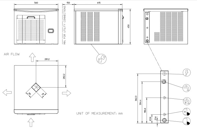 Production de glace : 133 kg/24h (air 10°C / eau 10°C) – 123 kg/24h (air 21°C / eau 10°C)
