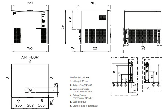 Avec une réserve intégrée de 181 kg et une capacité de production de 165 kg de glaçons par 24h (à 21 °C d’air et d’eau), la machine MXGM 437 est parfaitement adaptée aux environnements à forte demande. Ses dimensions de 773 x 705 x 721 mm et son poids net de 73 kg combinent puissance et compacité. Elle utilise le gaz réfrigérant R290, écologique et performant, réduisant la consommation énergétique et l’impact environnemental.