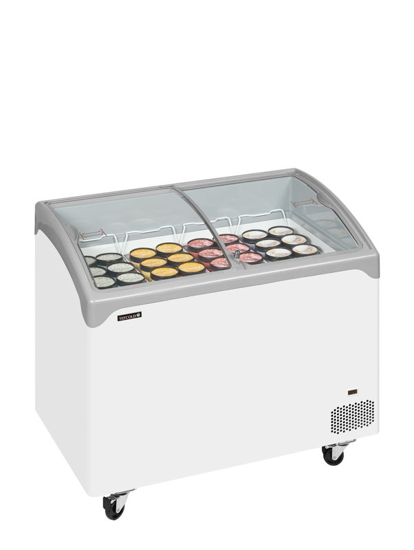 Congélateur coffre vitré bombé température -24/-14°C et capacité 286/218La gamme NIC-SCEB de congélateurs à glace haut de gamme présente un superbe design tout en rondeurs, avec des couvercles coulissants bombés. Ces modèles sont très stables et solides, tout en étant montés sur roues pour en faciliter le déplacement dans le magasin. Ces congélateur sont parfaits pour présenter des aliments surgelés comme les glaces et bâtonnets glacés. Ils sont fournis avec un ensemble complet de paniers.