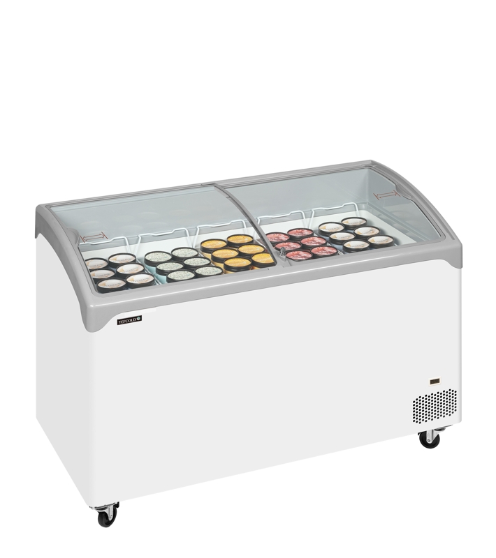 Congélateur coffre couvercles coulissants vitrés bombés température -24/-14°CLa gamme NIC-SCEB de congélateurs à glace haut de gamme présente un superbe design tout en rondeurs, avec des couvercles coulissants bombés. Ces modèles sont très stables et solides, tout en étant montés sur roues pour en faciliter le déplacement dans le magasin. Ces congélateur sont parfaits pour présenter des aliments surgelés comme les glaces et bâtonnets glacés. Ils sont fournis avec un ensemble complet de paniers.