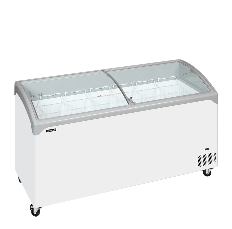 Congélateur coffre vitré à portes coulissantes bombées plage de température -24/-14°C