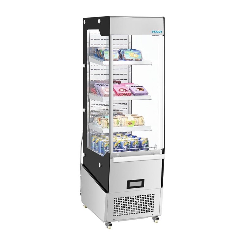 La vitrine réfrigérée libre-service Polar Série G 220 L est idéale pour la présentation en libre accès de produits frais dans les points de vente à fort passage tels que les boulangeries, sandwicheries, snacks, commerces de proximité et espaces de restauration rapide. Son format vertical compact de 512 mm de largeur et 838 mm de profondeur lui permet de s’intégrer facilement dans tout espace de vente, tout en offrant un volume utile de 220 litres parfaitement optimisé.