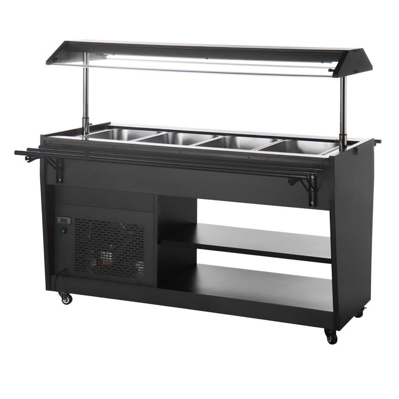 Le buffet réfrigéré Polar Série G noir est un meuble professionnel destiné à la présentation en libre-service des préparations froides telles que les salades, desserts, fruits ou entrées. Idéal pour les restaurants, hôtels, collectivités et espaces de restauration en libre-service, il allie élégance, performance et praticité. Conçu pour accueillir 4 bacs GN 1/1 jusqu’à 150 mm de profondeur, ce buffet offre une capacité généreuse tout en conservant un format compact adapté aux zones de service à fort passage.