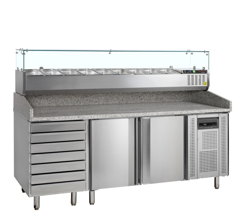 Table à pizza réfrigérée positive inox dessus granite avec 2 portes et 7 tiroirs 600x400 - 2045 x 800 x 1000 mm