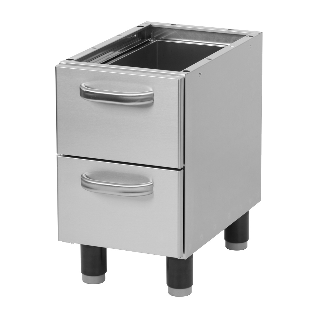 En usage réel, ce soubassement convient bien aux snacks, pizzerias, brasseries, laboratoires de préparation ou petites cuisines de restaurant où chaque centimètre compte. Les deux tiroirs neutres permettent de garder à portée de main bacs GN, ustensiles, consommables ou petits outils de maintenance, tout en restant dans une zone de rangement fermée et protégée. Les pieds réglables assurent un bon niveau de plan, important pour le confort de travail et le nettoyage du sol sous l’appareil de 11,5 kg, même sur carrelage irrégulier. Dans une organisation à service continu, ce type de soubassement neutre évite les allers-retours en réserve et stabilise la productivité de l’équipe, tout en restant une base simple, sans unité intégrée, donc fiable sur la durée et facile à entretenir.