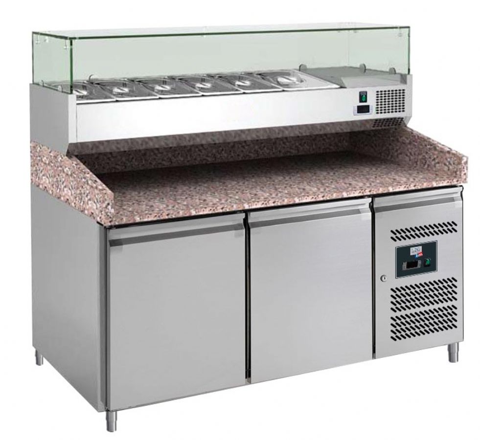 Meuble à pizzas dessus granit +2/+8°c avec 2 portes 600x400 et saladette à ingrédients au dessus