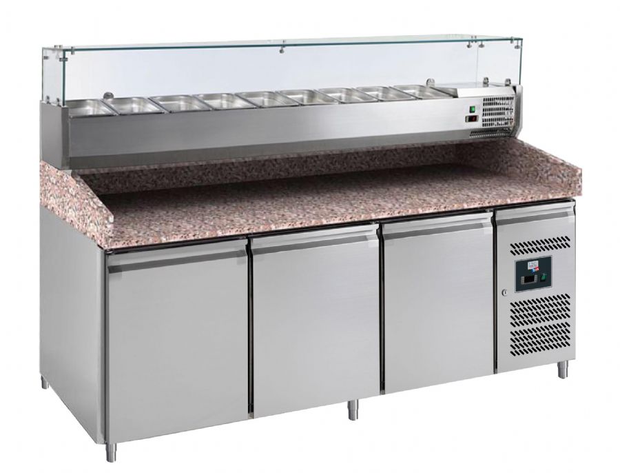 Meuble à pizzas dessus granit +2/+8°c avec 3 portes 600x400 et saladette à ingrédients au dessus
