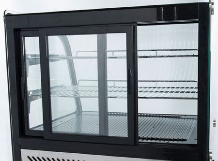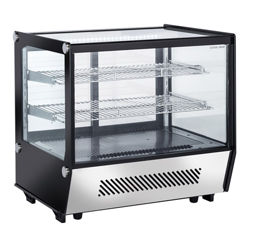 Vitrine réfrigérée de comptoir Verre carré avec cadre noir et acier inoxydable Dégivrage automatique par cycle de compresseur Contrôle numérique de l'affichage de la température Lumière intérieure LED Verre double couche anti-condensation Portes arrière coulissantes Étagères chromées réglables : 2 Support fixe assemblé sous le sous-sol : 4