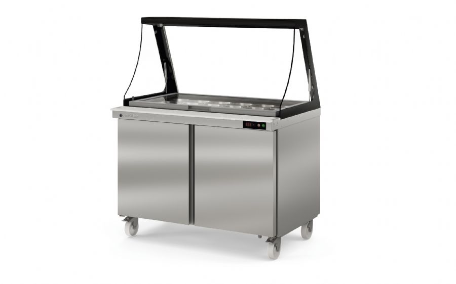 Meuble saladette mobile froid positif avec vitre frontale rabattable pour 18 bacs GN 1/6 - 1228x830x1551 mm