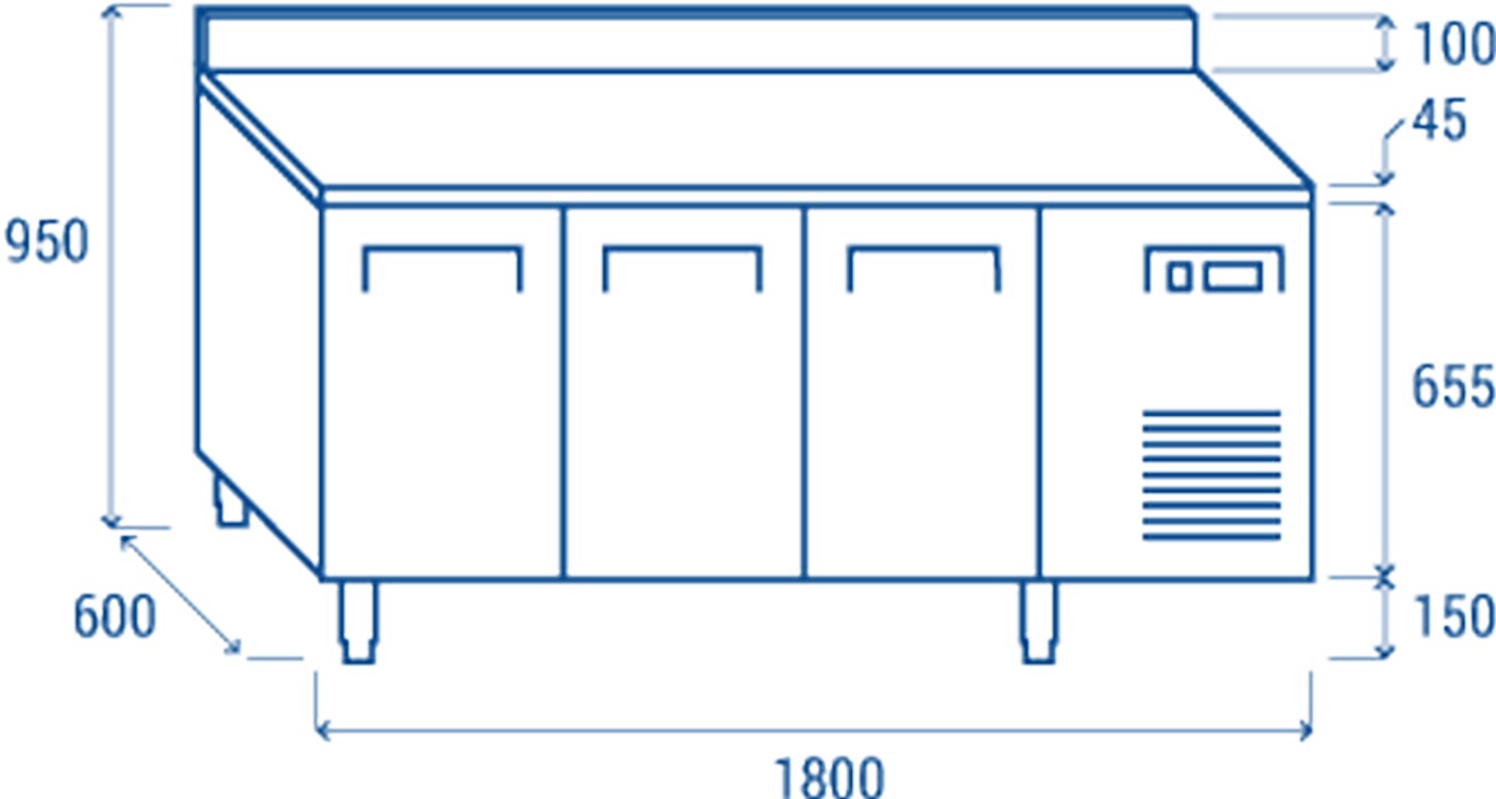 Dosseret : Avec Portes : 3 pleines Dimensions extérieures (LxPxH) (mm) : 1800x600x950 Dimensions intérieures (LxPxH) (mm) : 1260x485x585 Capacité (L) : 358 Température : -22° / -18° Gaz réfrigérant : R290
