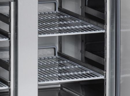 On retrouve cette table réfrigérée négative pour plateaux 325x410 de 4 portes avec dosseret en inox de haute qualité d'une capacité de 485 litres. Celui-ci fonctionne par refroidissement ventilé avec le gaz réfrigérant vert R290.