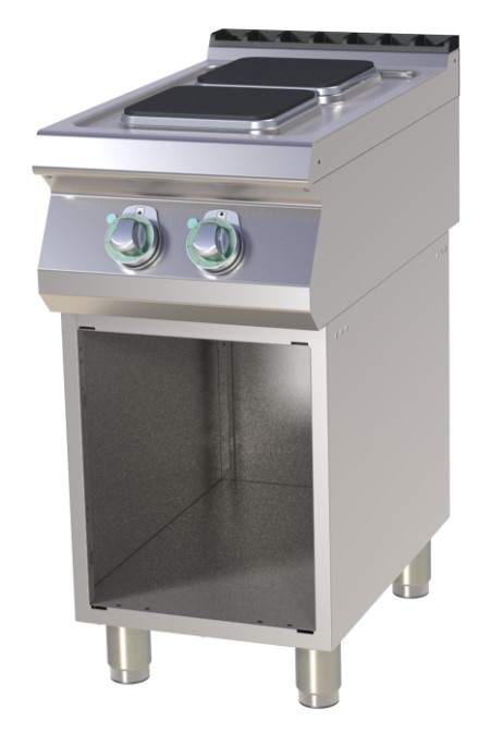 Cuisinière de restauration professionnelle 2 feux 2,6kW chacun électriquesur armoire ouverte