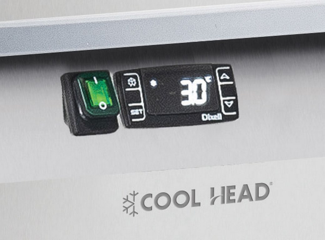 Côté pratique, la table réfrigérée 230L litres de Cool Head est munie de 2 portes à fermeture automatique et du dégivrage automatique avec chauffage électrique.