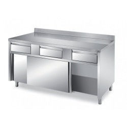 Table basse inox neutre adossée avec 3 tiroirs et 2 portes coulissantes 700 x 1400 x 850 mm