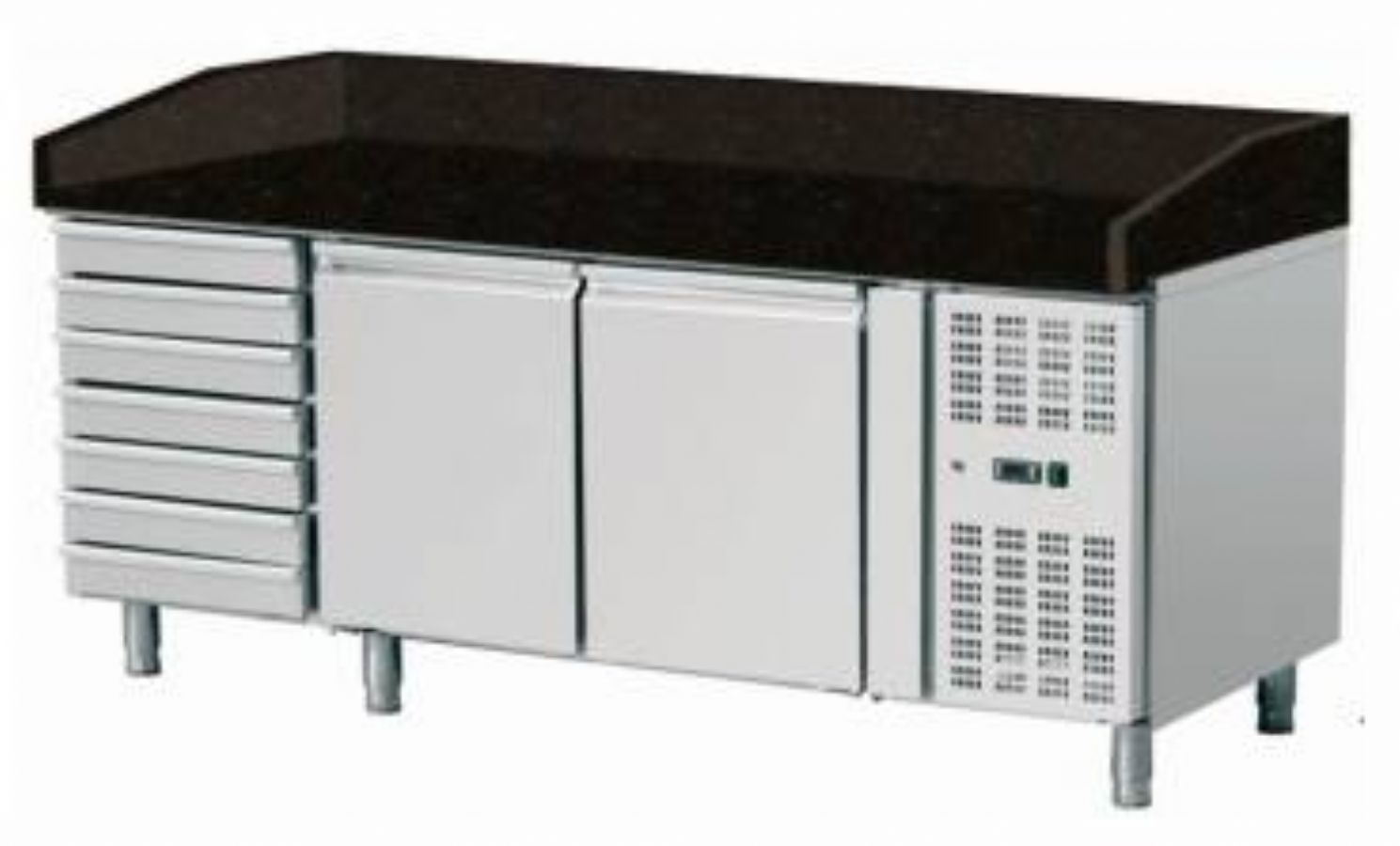 Meuble à pizza avec plan en granit noir 2 portes et 1 compartiment de 7 tiroirs -2/ +8°C - 580L