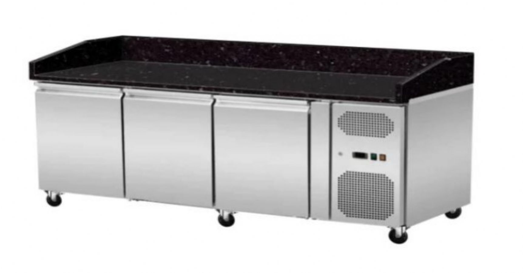 Table à pizza réfrigérée positive inox dessus granite avec 3 portes pleines battantes - 2045 x 800 x 1000 mm