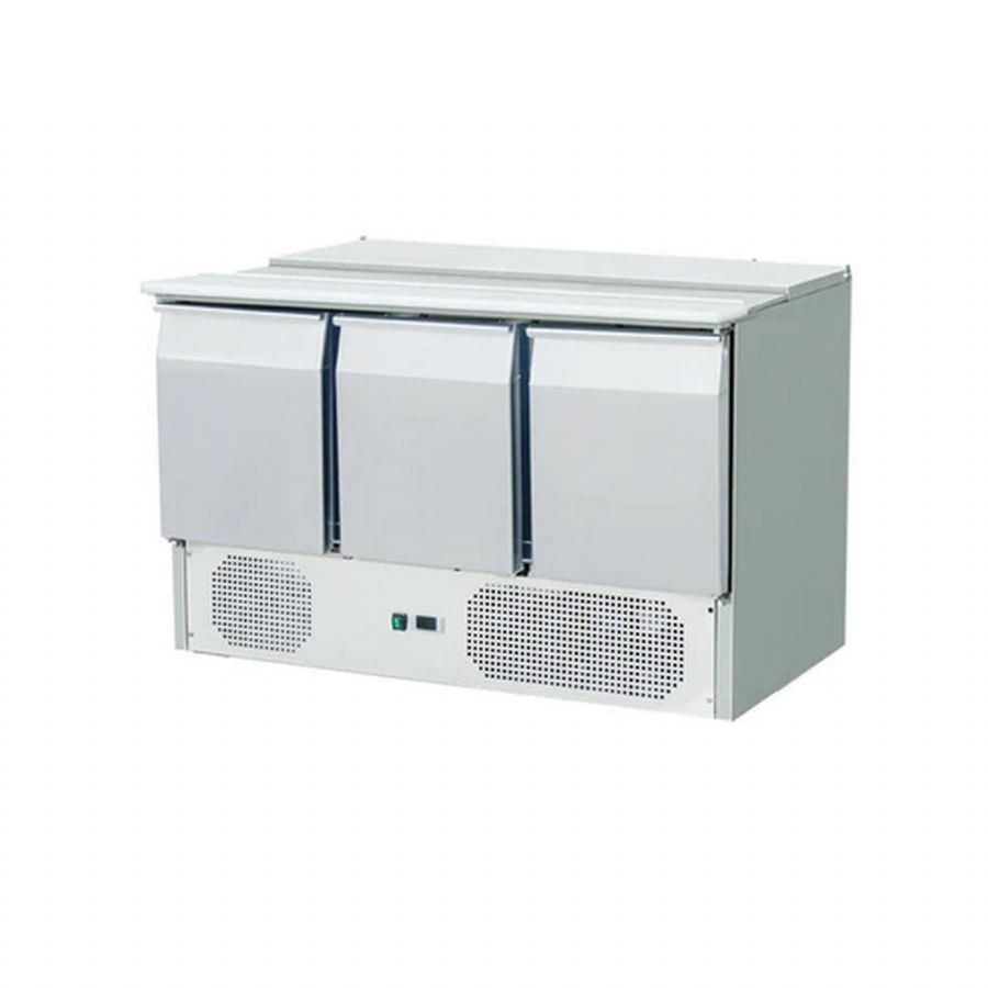 Table de travail réfrigérée positive avec 3 portes GN 1/1 et saladette bacs GN 1/6 - 1365x700x950 mm