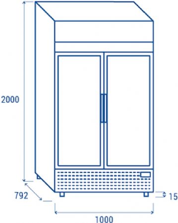 Lumière LED horizontale intérieure : Avec Nombre d'étagères : 4 ajustables Dimensions extérieures (LxPxH) (mm) : 1000x792x2000 Dimensions intérieures (LxPxH) (mm) : 890x670x1533 Capacité (L) : 882 Température : +1° / +10° Température d'essai : K1 (+0° / +7°) Gaz réfrigérant : R290