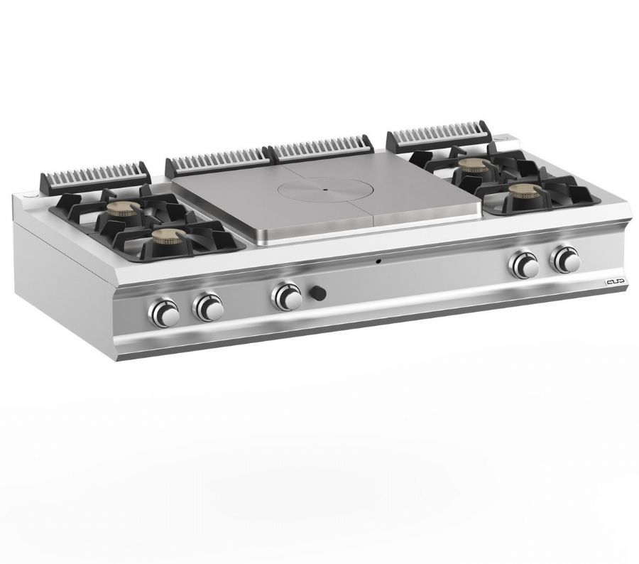 Cette cuisinière unique possède des caractéristiques innovantes et efficaces, telles que ses 4 brûleurs de 7 KW et une puissance totale de gaz de 37 kW. Sa conception permet une utilisation continue et polyvalente, idéale pour la préparation de plats sophistiqués. Conçue pour un usage professionnel intense, elle offre une cuisinière à gaz professionnelle durable et performante, intégrant des technologies qui augmentent la productivité.