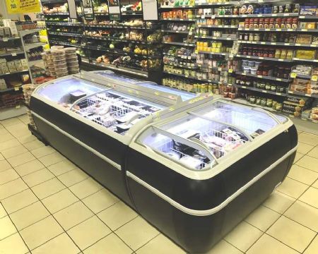 Congélateur vitrine îlot de supermarché gris avec 2 couvercles coulissants incurvés 334 L - 1470x812x915